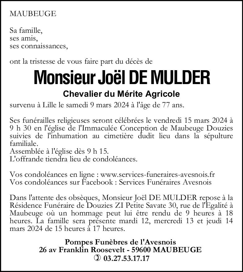 Avis de décès de M. DE MULDER Joël